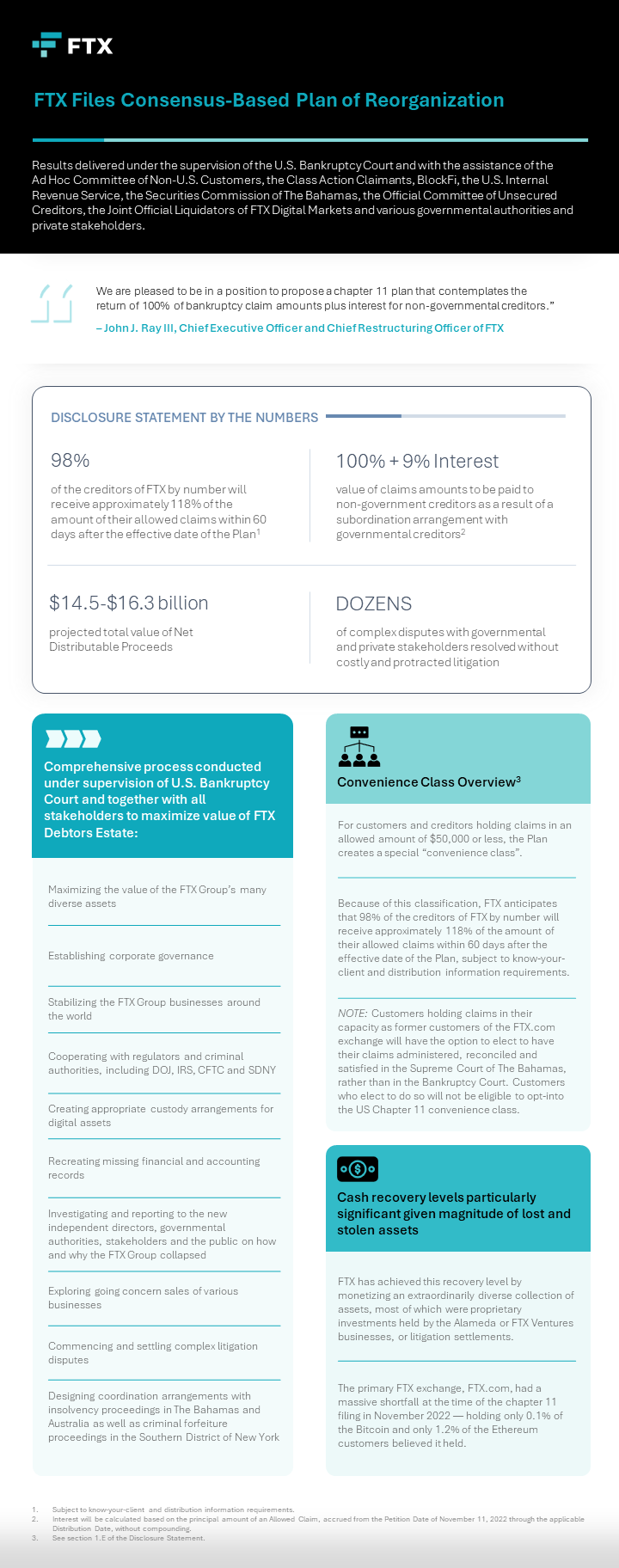 “Os devedores da FTX apresentaram hoje seu Plano de Reorganização alterado e a Declaração de Divulgação que o acompanha ao Tribunal de Falências dos EUA. Leia sobre isso aqui https://prnewswire.com/news-releases/ ftx-files-consensus-based-plan-of-reorganization-302138948.html?tc=eml_cleartimeand … abaixo:”